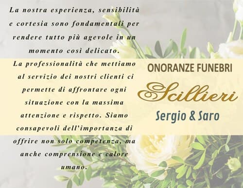 Per decidere i dettagli di come realizzare gli addobbi floreali, puoi rivolgerti all'agenzia “Onoranze Funebri Scillieri”. Sapremo consigliarti la composizione più adeguata.